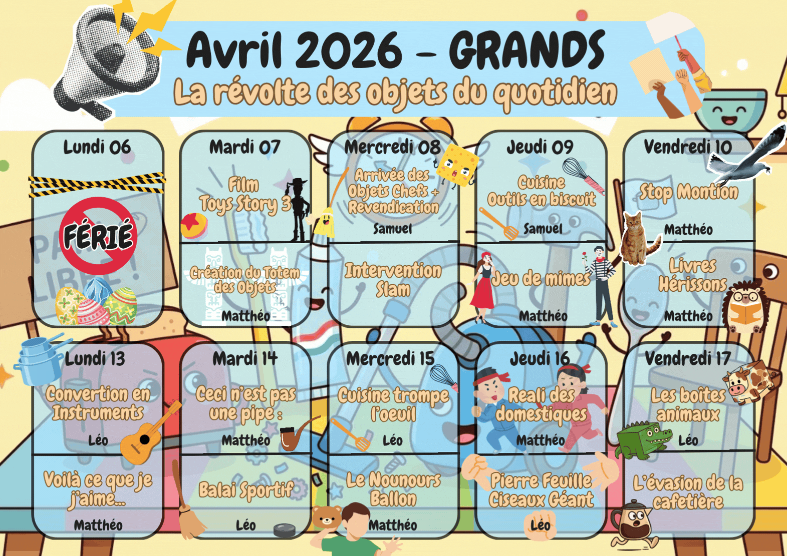 Sur le thème "la révolte des objets du quotidien" nous inviterons vos enfants à porter un nouveau regard sur les objets qui nous entourent. Ateliers d'art contemporain, exploration de l'imaginaire, bricolage, jeux d'expression, tout est prévu pour des vacances hautes en fantaisie.